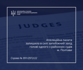 12 вересня 2022 року Апеляційна палата ВАКС розглянула апеляційну скаргу захисників голови одного з районних судів м. Полтави на ухвалу слідчого судді ВАКС від 22 серпня 2022 року про застосування запобіжного заходу.