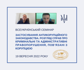 Суддя Апеляційної палати ВАКС Дмитро Михайленко та суддя ВАКС Олексій Кравчук 19 вересня 2022 року виступили викладачами на Всеукраїнському семінарі Національної школи суддів України «Застосування антикорупційного законодавства. Розгляд справ про кримінальні та адміністративні правопорушення, пов’язані з корупцією».
