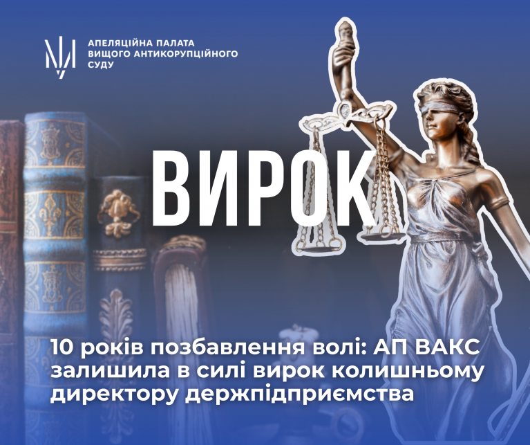 8 січня 2026 року Апеляційна палата ВАКС залишила в силі вирок ВАКС від 25.09.2025, яким колишнього директора державного підприємства визнано винуватим у вчиненні кримінальних правопорушень, передбачених ч. 5 ст. 191, ч. 2 ст. 28, ч. 1 ст. 366 КК України.