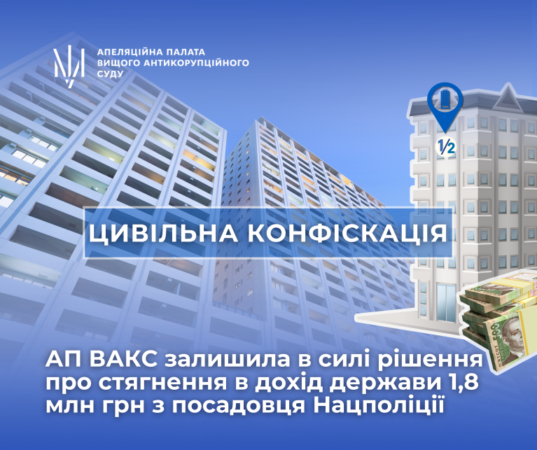 Йдеться про 1/2 частини квартири в м. Києві, у дохід держави стягнуто її вартість у сумі 1,8 млн грн.