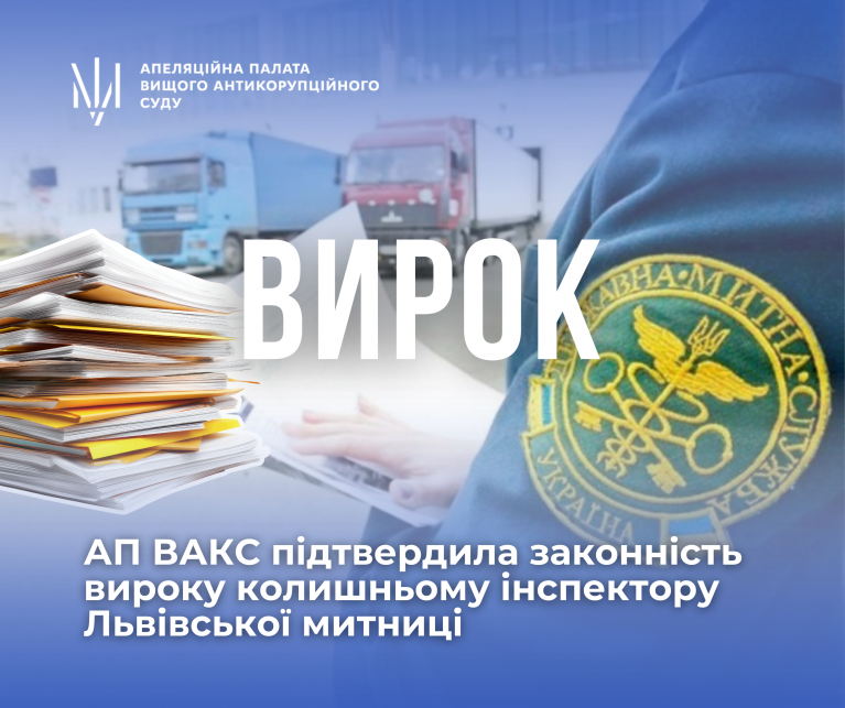 18 лютого 2026 року Апеляційна палата ВАКС залишила в силі вирок ВАКС від 04.09.2025, яким колишнього інспектора Львівської митниці визнано винуватим у зловживанні службовим становищем та службовому підробленні (ч. 2 ст. 364 та ч. 1 ст. 366 КК України).