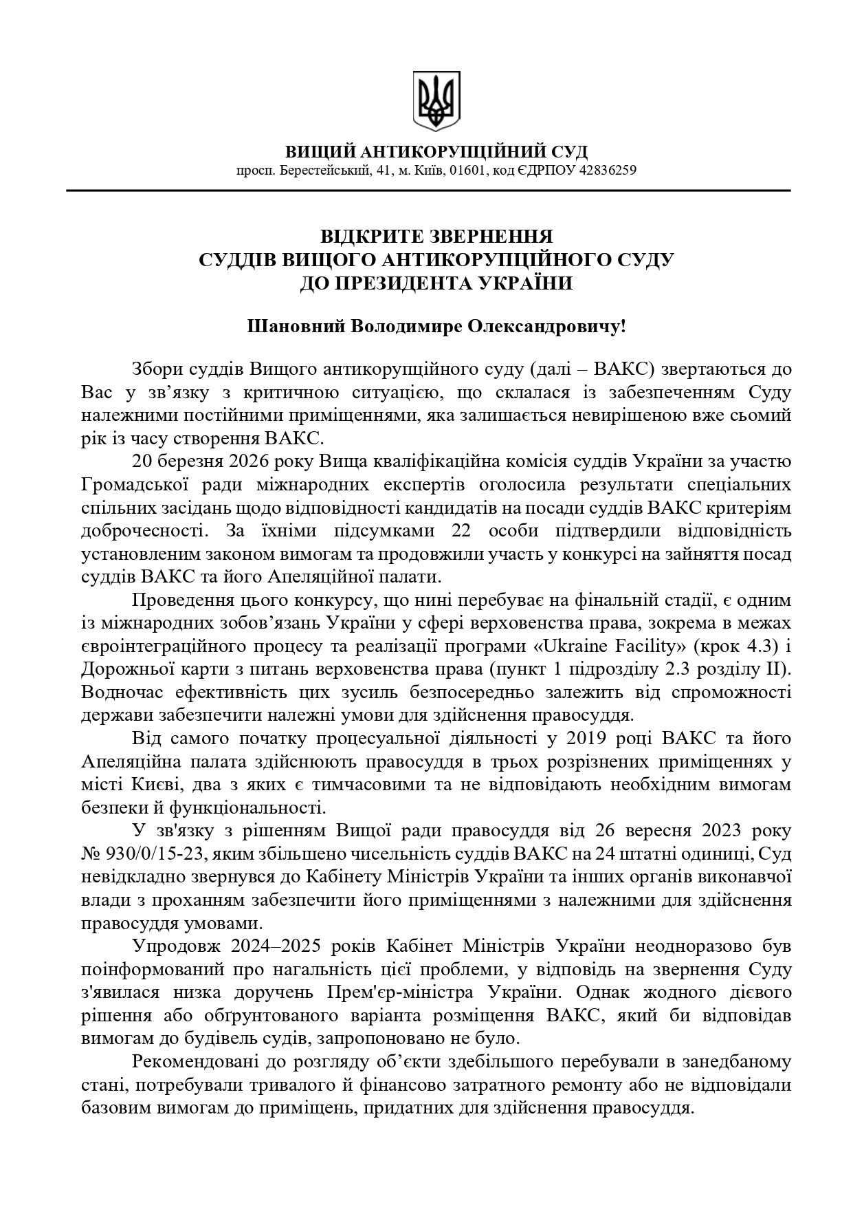 Текст відкритого звернення суддів Вищого антикорупційного суду додається: