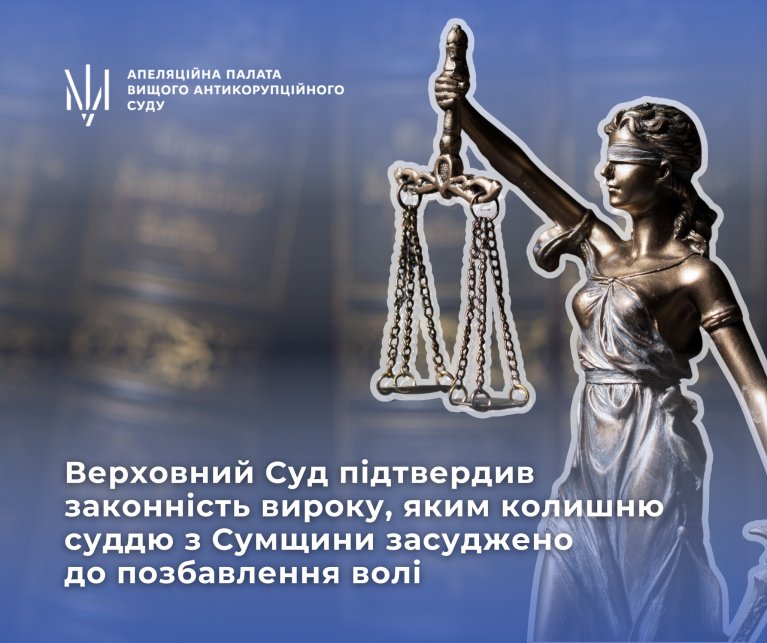 Касаційний кримінальний суд у складі Верховного Суду підтвердив законність вироку ВАКС від 26.06.2024, а також рішення Апеляційної палати ВАКС від 15.05.2025, якими колишню суддю Господарського суду Сумської області Н. Спиридонову визнано винуватою в одержанні неправомірної вигоди (ч. 3 ст. 368 КК України).