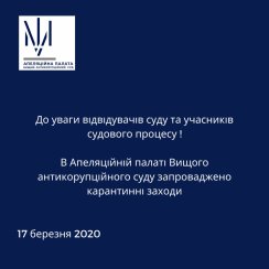 Відповідно до постанови Кабінету Міністрів України від 11.03.2020 року №211 «Про запобігання поширенню на території України коронавірусу COVID-19», з метою запобігання поширенню інфекційних захворювань, рішенням зборів суддів Апеляційної палати Вищого антикорупційного суду від 17.03.2020 №3, на час карантину запроваджується особливий режим роботи, а саме: