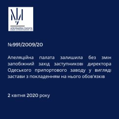 Сьогодні, 2 квітня 2020 року, відбулося судове засідання по розгляду апеляційної скарги захисника підозрюваного, заступника директора Одеського припортового заводу, на ухвалу слідчого судді Вищого антикорупційного суду від 06 березня 2020 року, якою до підозрюваного застосовано запобіжний захід у вигляді застави в розмірі 1 млн 51 тис грн. з покладенням на нього обов’язків.