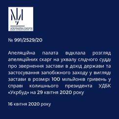 Суд відклалв розгляд апеляційних скарг на ухвалу слідчого судді про звернення застави в дохід держави та застосування запобіжного заходу у вигляді застави в розмірі 100 мільйонів гривень у справі колишнього президента УДБК «Укрбуд» на 29 квітня 2020 року