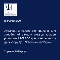 Сьогодні, 7 травня, Апеляційна палата Вищого антикорупційного суду розглянула апеляційну скаргу захисника підозрюваного, генерального директора Державного спеціалізованого підприємства "Об'єднання "Радон"" на ухвалу слідчого судді Вищого антикорупційного суду від 28.04.2020 про застосування запобіжного заходу у вигляді застави.