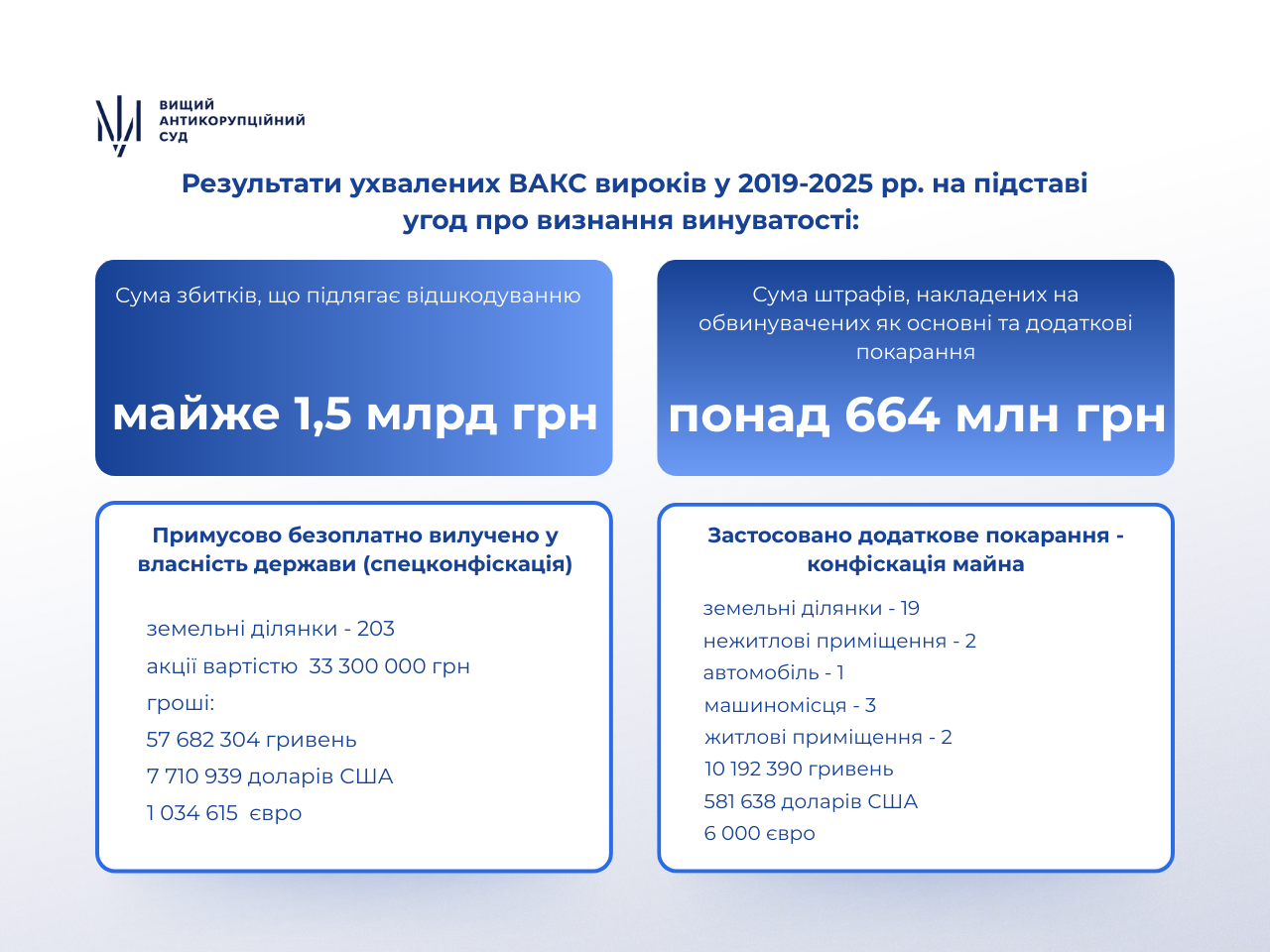 Лише за затвердженими ВАКС у минулому році угодами про визнання винуватості до бюджету має бути перераховано майже 1 млрд грн відшкодування завданих кримінальними правопорушеннями збитків (за період 2019-2025 років – це майже 1,5 млрд грн). Сума штрафів, накладених на засуджених у 2025 році осіб як основні та додаткові покарання, становить 576,9 млн грн.