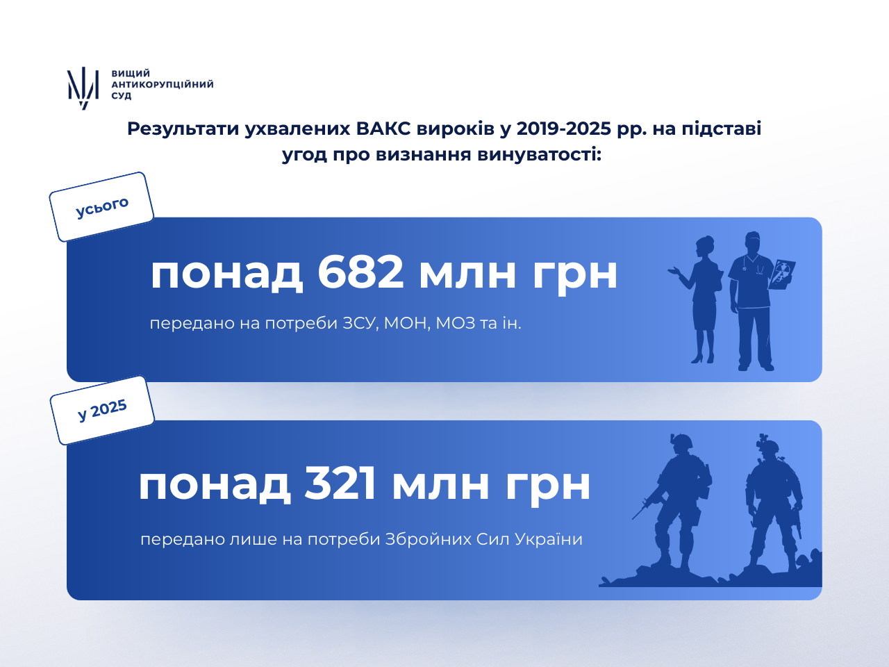 Thanks to plea agreements concluded in 2025, more than UAH 321 million was allocated to meet the needs of the Armed Forces of Ukraine (for comparison, this amount is almost equivalent to the cost of approximately 1,000 high-capacity Mavic 3 Pro quadcopters or several short-range air defense systems). In total, over UAH 682 million was transferred to support the Armed Forces of Ukraine, the Ministry of Education and Science of Ukraine, the Ministry of Health of Ukraine, and other institutions during the period from 2019 to 2025.
