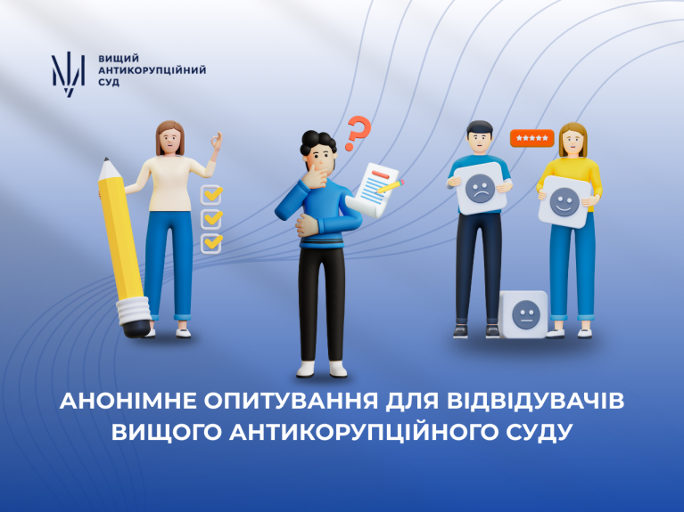 Управлінська команда Вищого антикорупційного суду прагне зробити ваш досвід перебування в приміщеннях суду комфортнішим і зручнішим. З цією метою, а також для отримання зворотного зв’язку від учасників судового процесу та відвідувачів, ми проводимо анонімне опитування, яке допоможе нам підвищити ефективність роботи та покращити якість судових сервісів.